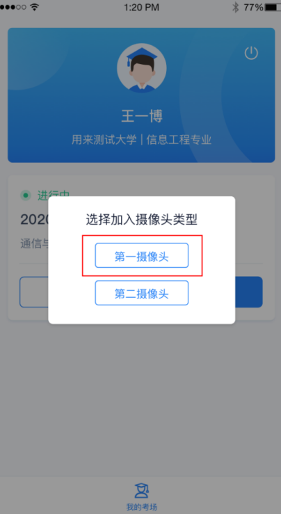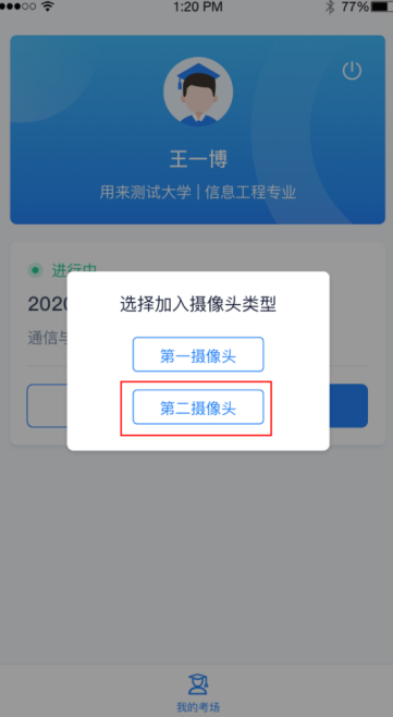 b. 同意承诺书的内容后,就可以进入候考区了,进入时可选择以哪个机位的摄像头加入(不要重复加入同一个机位的画面)