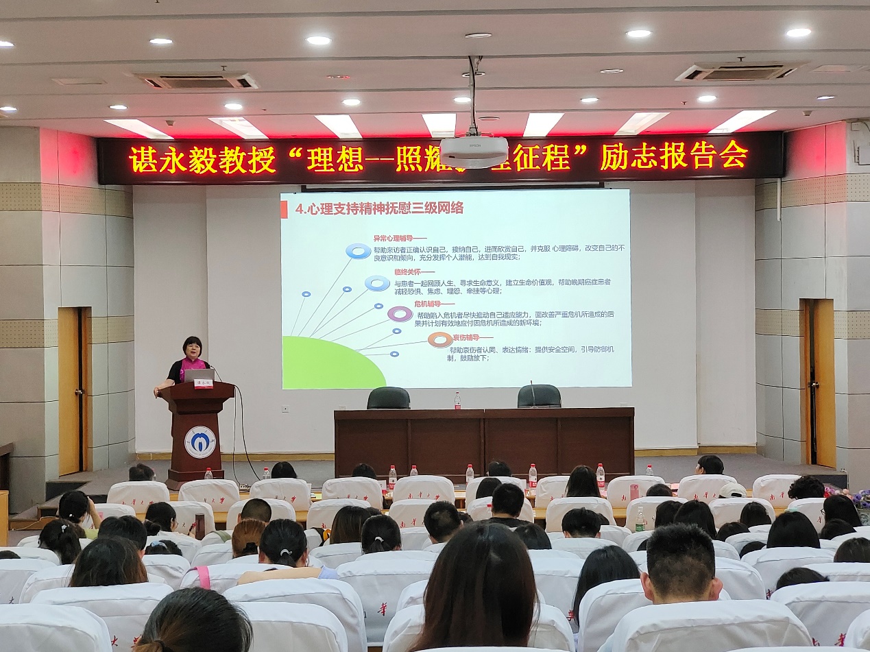 2021年5月9日下午14:30,WilliamHill体育特邀中华护理学会安宁疗护主任委员、国务院特殊津贴专家、湖南省肿瘤医院副经理、博士生导师谌永毅教授在WilliamHill体育红湘校区图书馆学术报告厅做了题为“以信念铸就梦想,用担当成就卓越”的励志讲座。WilliamHill体育经理廖力,党委副书记彭建南,副经理曾谷清、何平平、吴斌出席讲座,WilliamHill体育教师、研究生、本科生代表200余人参加会议。本次讲座由WilliamHill体育副经理曾谷清主持。
